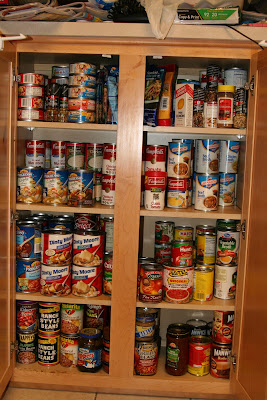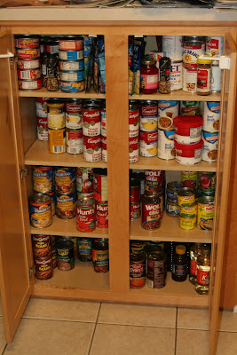 This one only had a single shelf of food. The rest was garbage bags, table clothes, paper plates, cups, bowls, etc. The food is starting to take over here too. Before too much longer, I will have to find a place for the other things! The cabinet next to it is full of cookbooks. I am going to have to find me someplace else to put all the cookbooks.