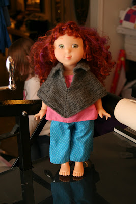 So here is a picture of Fancy Nancy in the doll poncho I knitted. Pretty darn cute if you ask me!