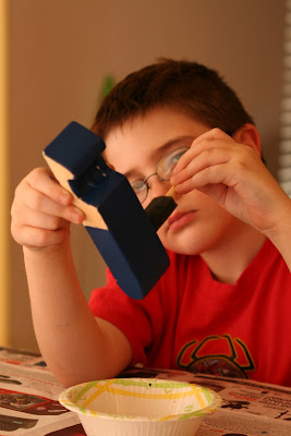 Kyle painting his Pinewood Derby Car – navy blue base coat.