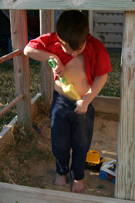 Lance using the shovel to shovel sand into his pants! I was beside myself laughing hysterically. I suppose this is a step up from “tasting” or “eating the sand” that was so common not so long ago.