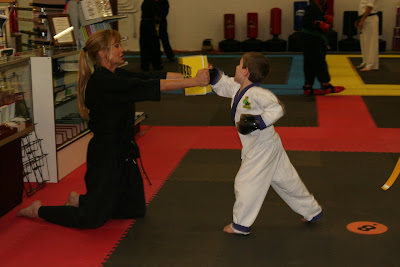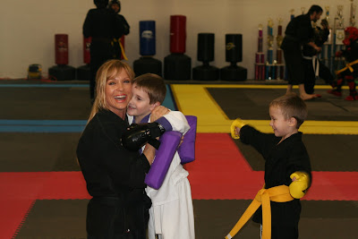 Evidently, the test was really fun because Lance was so excited and he gave his instructor Carol Parenti a great big hug right in the middle of it. She has so much patience with those little kids, even when they are having a hard time “following directions” as my sister described her experience watching the test behind the video camera. They have so much energy and she reels it in and channels it to make their karate learning experiences a lot of fun.