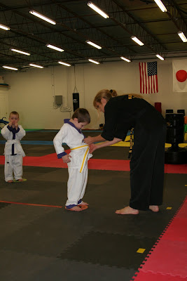 Then each of the children that tested (there were 3 of them) had their new belts tied on them by the instructor. Lance was more than happy to stick his stomach out for that one.