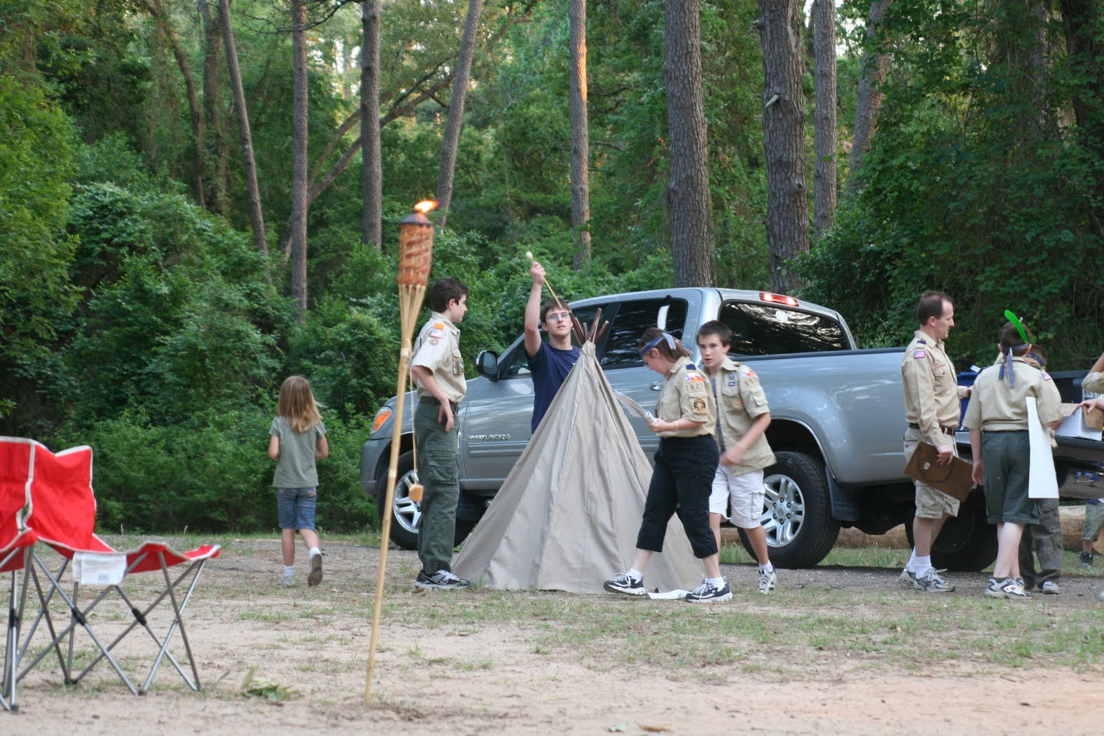 Setting up the teepee for the Indian theme of the ceremony presentation. The Cub Scout leaders recruited some of the older Boy Scouts to help with the ceremony. Incidentally, the Boy Scouts involved had parents or brothers involved in the ceremony in someway. Andrew had bother parents as either Scout or Cub Scout leaders and his brother was being awarded. Ben’s brother was being awarded. And Tyler’s mother is one of the Cub Scout Den Leaders. Recruitment of Boy Scouts was not difficult at all.