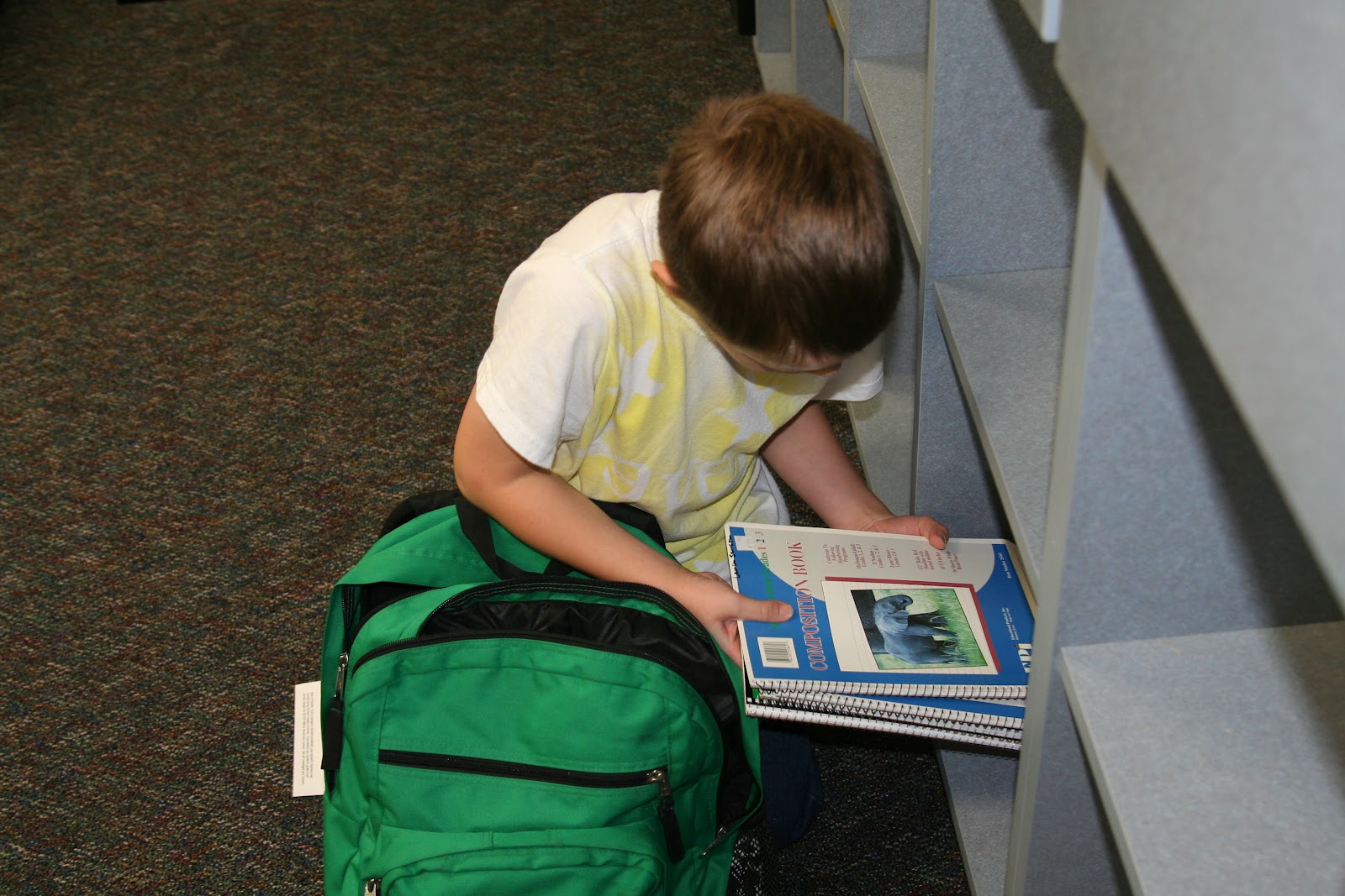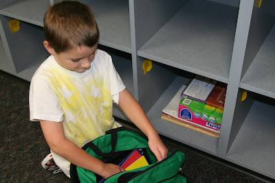 Each of the classrooms have “cubbies” in them for the children’s supplies and things. He will put his backpack, lunchbox, and bicycle helmet in there every day when he comes into the classroom. Here he is putting his school supplies into his cubby. I am sure that they will be sorted out later to where they need to go and whatnot, but today she was having each of the children just put everything neatly in their cubby until Monday.