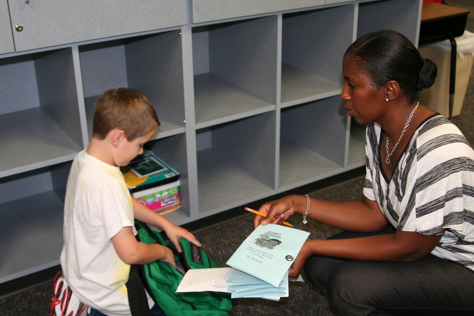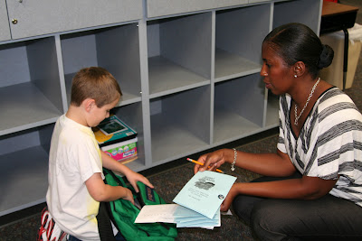 Ms Johnson had a little surprise for each of the students. It was something for them to open and read with their parents the night before school. Here she is handing Lance his little handout (surprise).