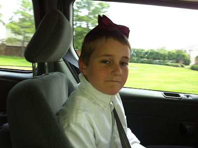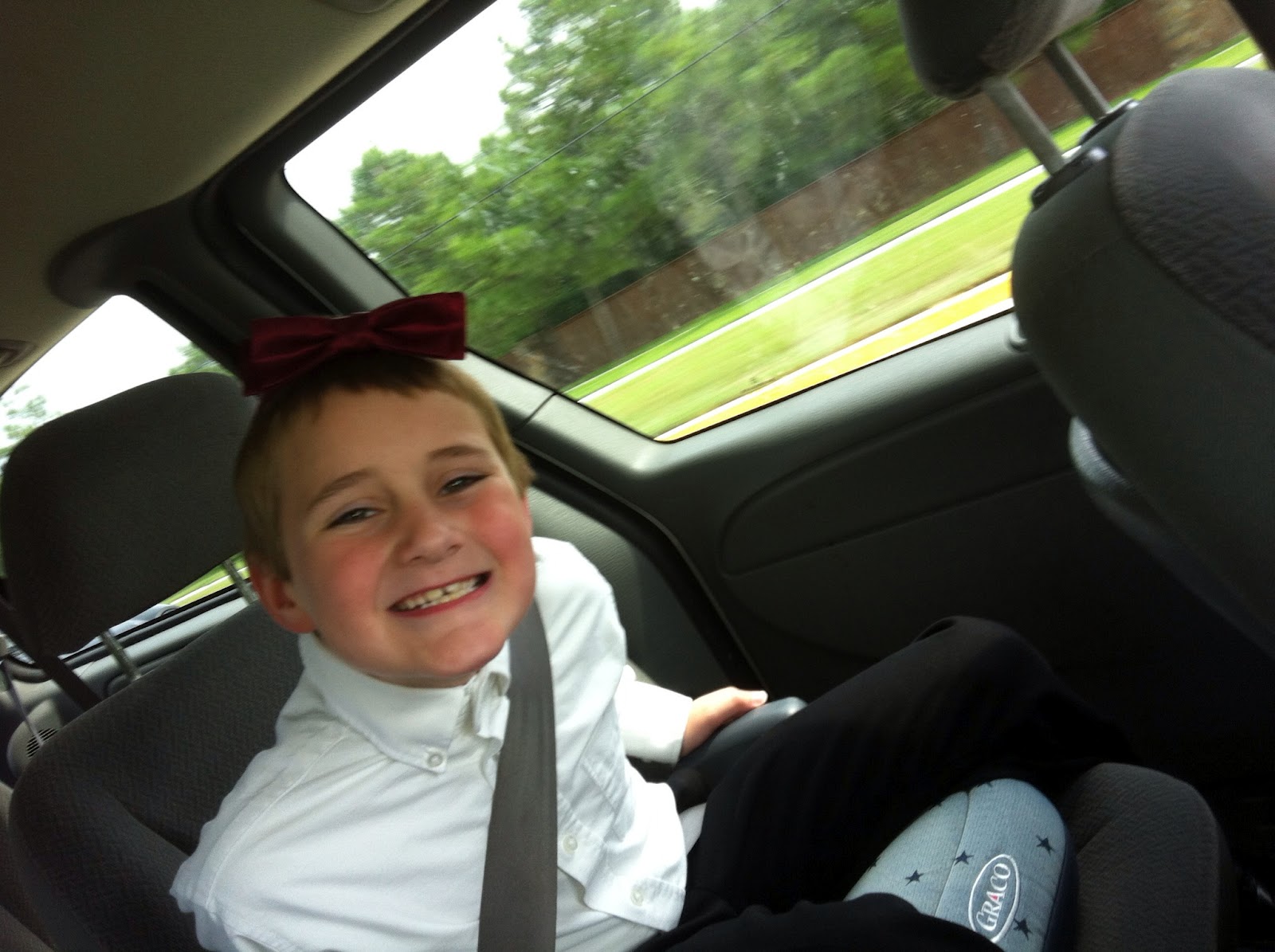 I hear from the back seat, “Look mom, I’m a girl. I have a bow.” He was totally being cute with his high pitched girly voice. I look back in the rear view mirror to see his bow tie perched upon his head instead of around his neck.