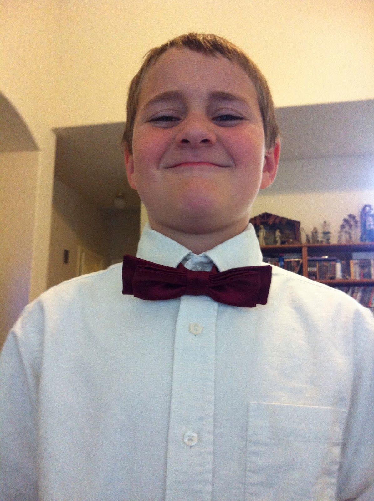 Here is Lance sporting a maroon bow tie. This bow tie was right off his father’s tie rack. It has been around a long time. A little big, but we made it work. He was so proud of that bow tie.