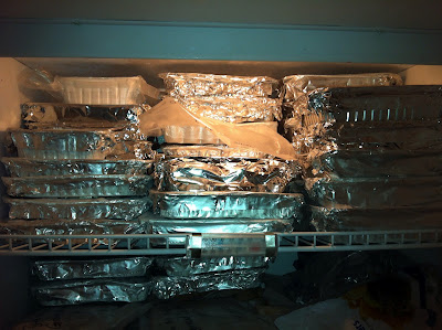 This is the top shelf of my upright deep freeze. It is full! You will notice that there are even pans of stuff that were moved down to the shelf below because they did not fit. To give you the magnitude of this, some of those are two deep.