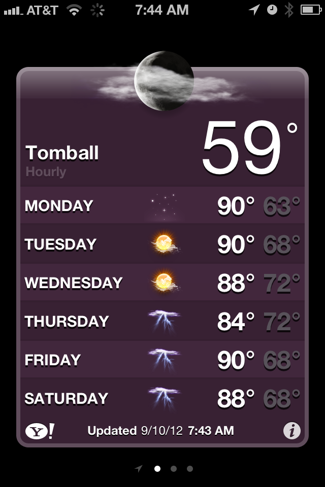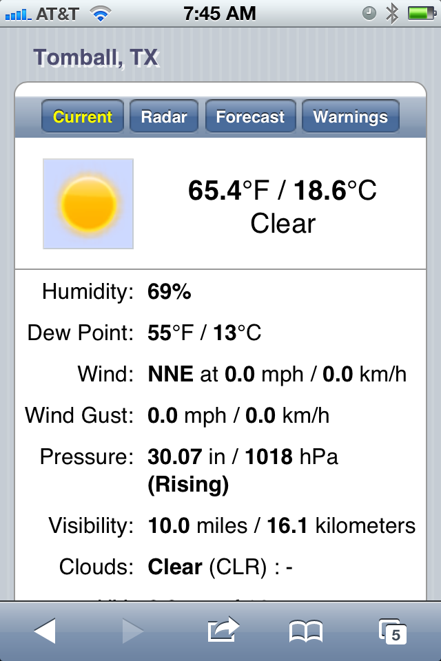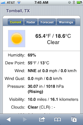 The bike ride this morning was outstanding! It was brisk compared to other mornings. Just amazing. Lance asked the question about what the weather was going to be like before we left. I snapped these screen shots before we left. Unfortunately, there was some disagreement between the iPhone app pulling from Yahoo! weather and the Weather Underground website. Either way, it was wonderful.