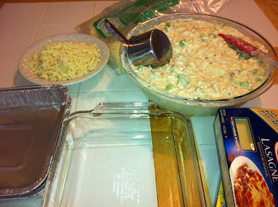 Here is my modified Chicken Veggie Alfredo Lasagna filling and other supplies ready to go. I am using the glass pan for tonight’s dinner and the foil pans for the ones that will go in the freezer.