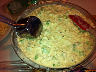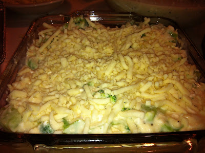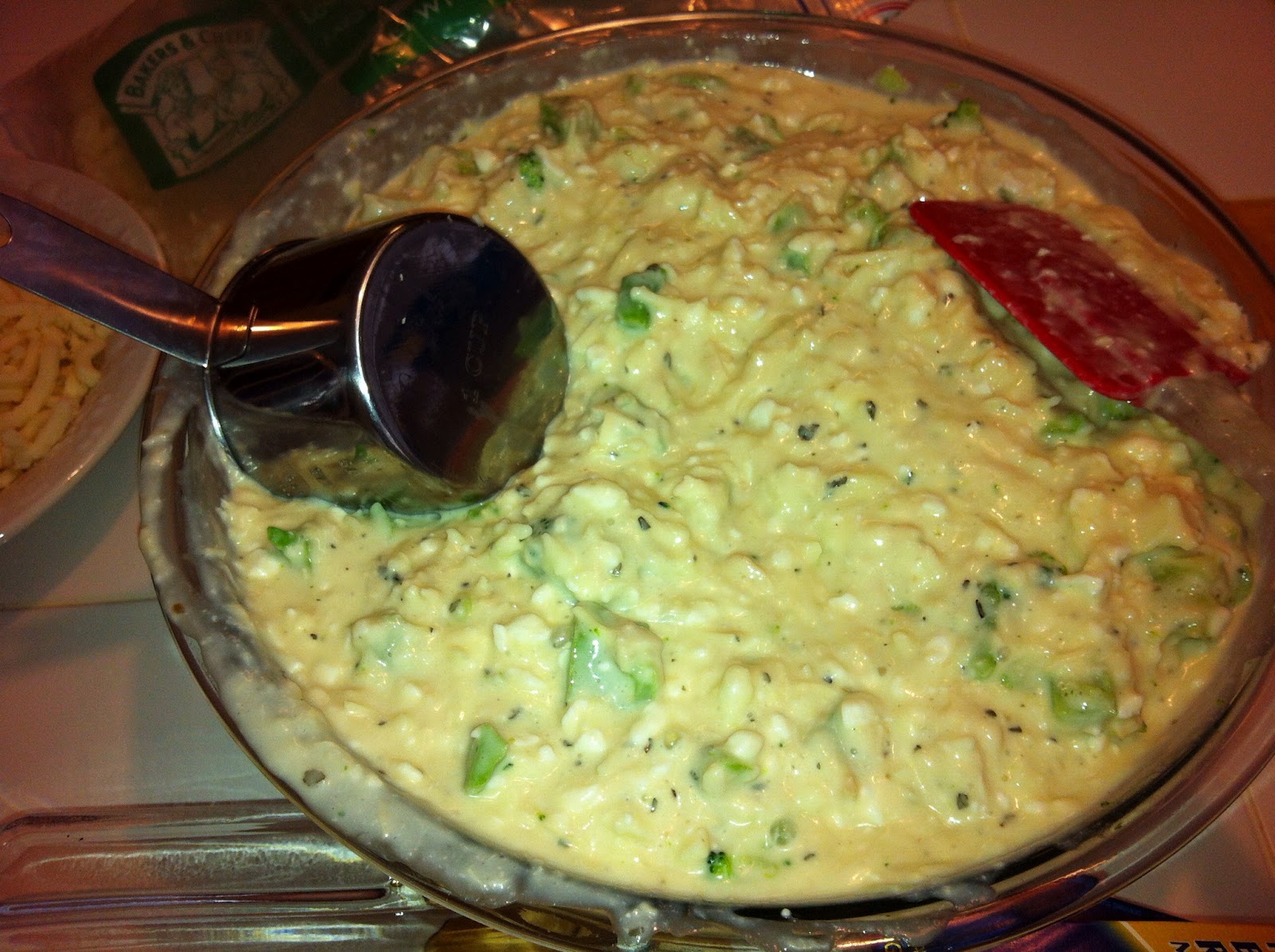 A close up of my Alfredo Lasagna slop. Yummy delicious broccoli chunks, seasoning, cheese, chicken, and everything.