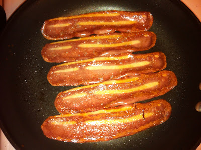 It really does have less fat than regular bacon and even turkey bacon. You have to spray the pan to keep it from sticking to the pan sometimes. It depends on the pan. It does not have that much fat in it. In that aspect, it is good. Notice the look of it? It does not look that good does it? It really is not that bad, but you have to get past the look.
