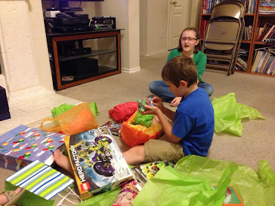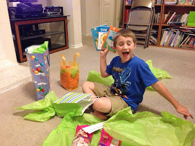 He got some books to read. He was very excited about these. He got two Paddington Bear books to read. He has fallen totally in love with Paddington Bear since we brought back a Paddington Bear and a collection book from London a year ago. He slowly made his way through the stories, but he read them. He has asked for more, but they have been hard to find at affordable prices (or sometimes even in print). I struck it lucky when I found them on the shelf at Half Price Books on Saturday and found two of them! The third book is the second book in another series he is reading.