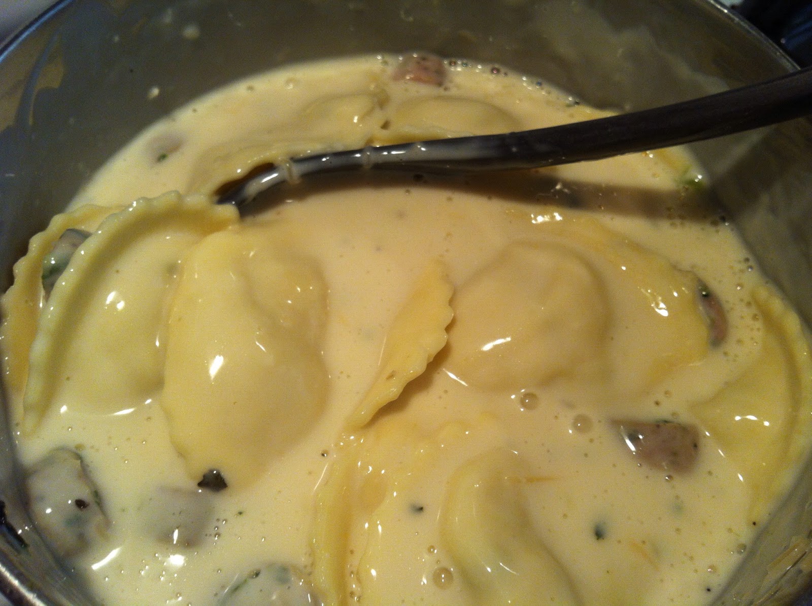 Here is the Grilled Chicken and Four Cheese Ravioli with a tomato based sauce and the Spinach and Garlic Chicken Sausage. It works nicely with a tomato based sauce. I used a jarred spaghetti sauce. Use one of your liking. I added 1 tsp of Penzeys Spices Italian Seasoning and 1/2 cup shredded Parmesan Cheese.