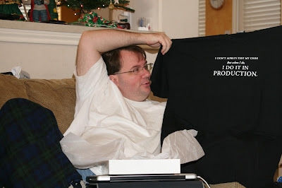 Santa brought Ben a new t-shirt with a computer programming saying on the front. He looks happy about that. I am not sure if the sentiment being conveyed in the saying is 100% true or not.