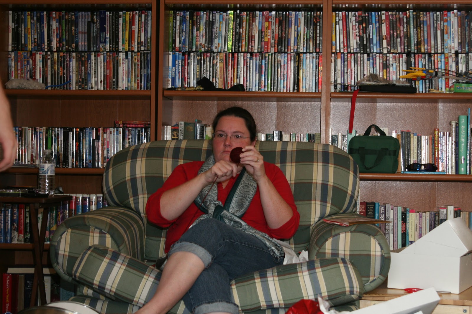 Now, I have to say that after the duct tape experience, I was not going to go down easy. There was going to be some play back on this. I knew there was going to be yarn involved as they asked where it was. After consulting with my friend, Linn Macie, she decided that I should sit there and knit something with the yarn as I took it off the gift. Clearly, that it was that thoughtful of them to give me yarn, I should use it, right? Well, I was not going to be that mean and take that long, but I did sit and wind the yarn nice and neatly into a ball. I can knit with it now…later.