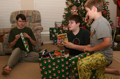 I am not sure when unwrapping gifts became such a production for this child, but this was only the start of it for the day. His brothers unwrapped twice as many in half the time. It was a bit surprising. A knife? Yes, that was involved. Neatness? Yes, that too was involved. Short of getting a mathematical equation out to make sure it was done correctly every time…I love this kid too…
