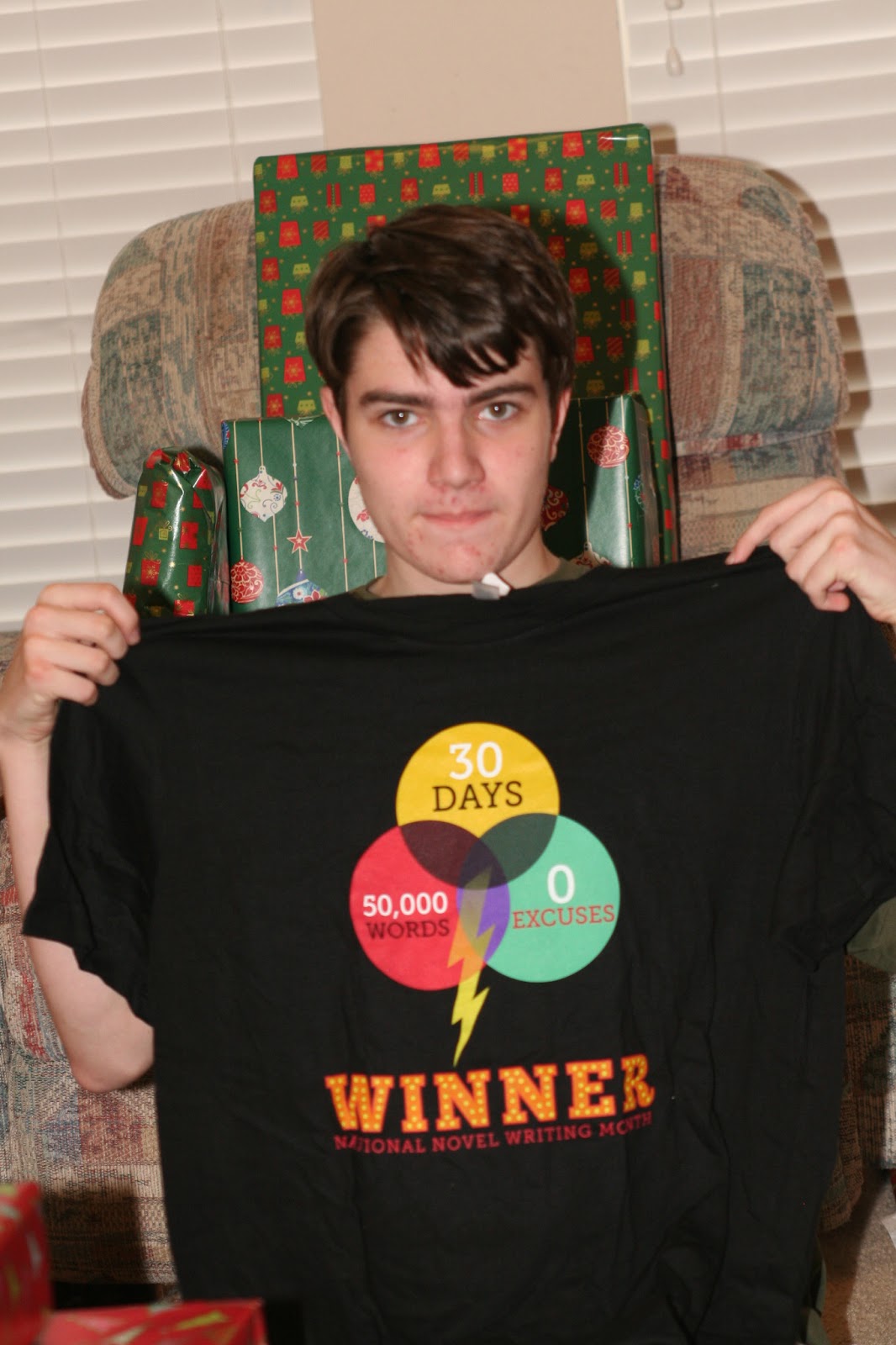 Andrew received a shirt marking his winning moment for National Novel Writing Month (NaNoWriMo) in November. He wrote a 50,000 word book in 30 days. He did it. His mother bought him the shirt that said he did. I am impressed by any stretch of the imagination. I confess to registering with NaNoWriMo two years in a row now. I have not written a single word. So for Andrew to actually register and write 50,000 words, I am seriously impressed especially with his workload at school.