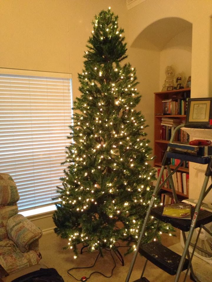 I am down to my last bulb. I have bulbs still out. I am probably only a third of the way through fluffing the tree. There are still three dark spots on the tree.
