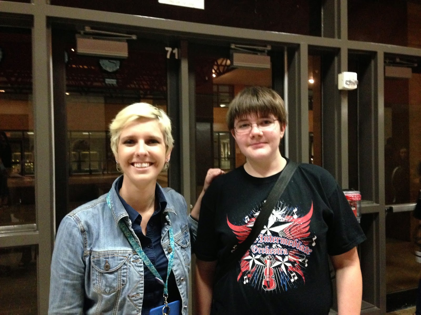 There was some discussion between Ms Marcelle Martin and some of the high school students before the concert began (stage right). This was a discussion about some of the announcements that were to be made during the concert. It is not uncommon for the high school students to help out at the junior high school concerts. It is a way for the high school students to give back to the place where they got their start. Andrew is the student in the black t-shirt looking down.