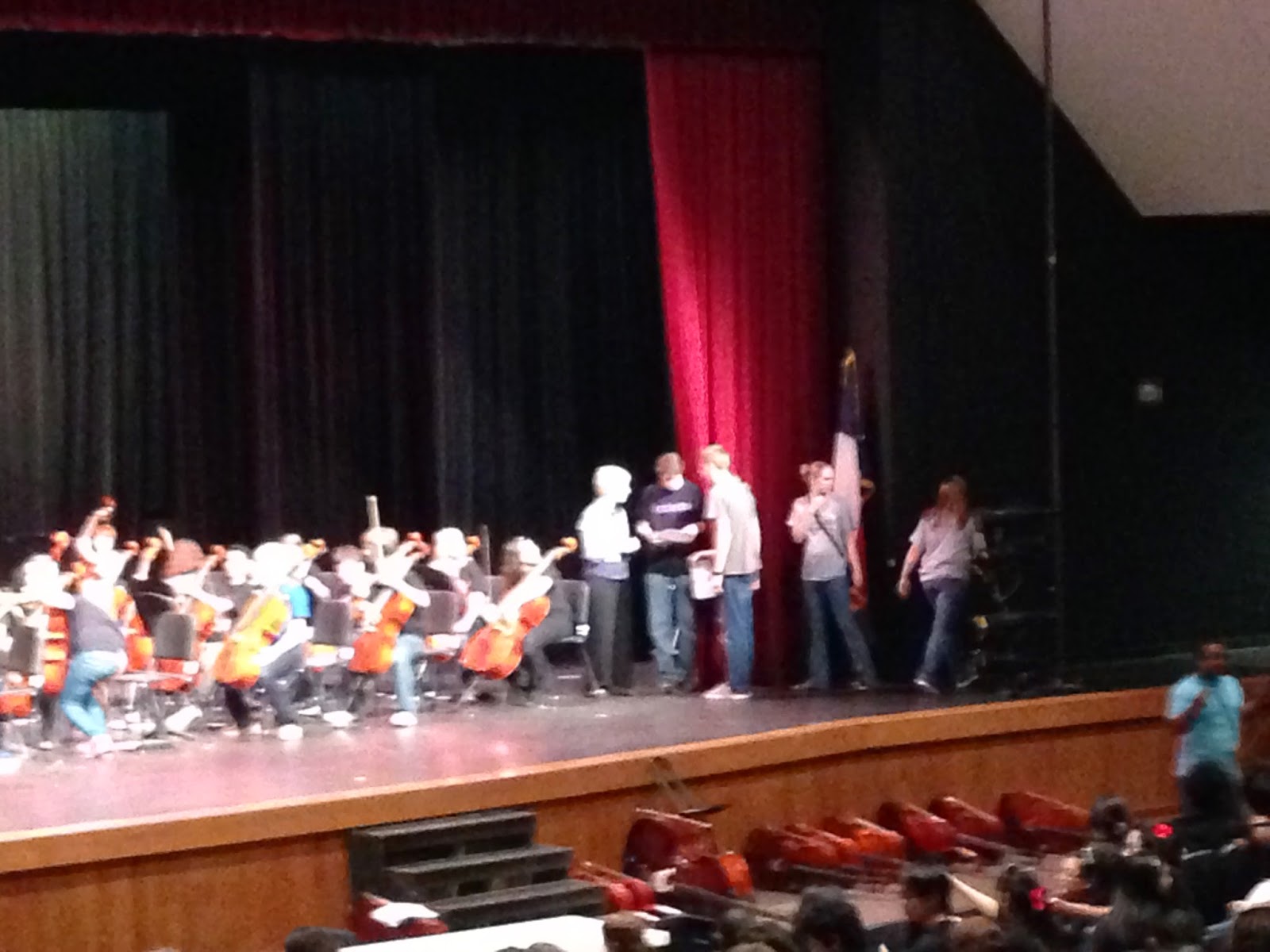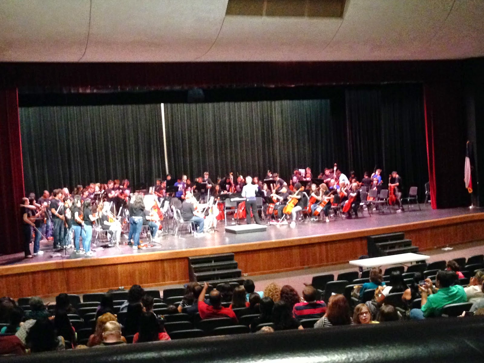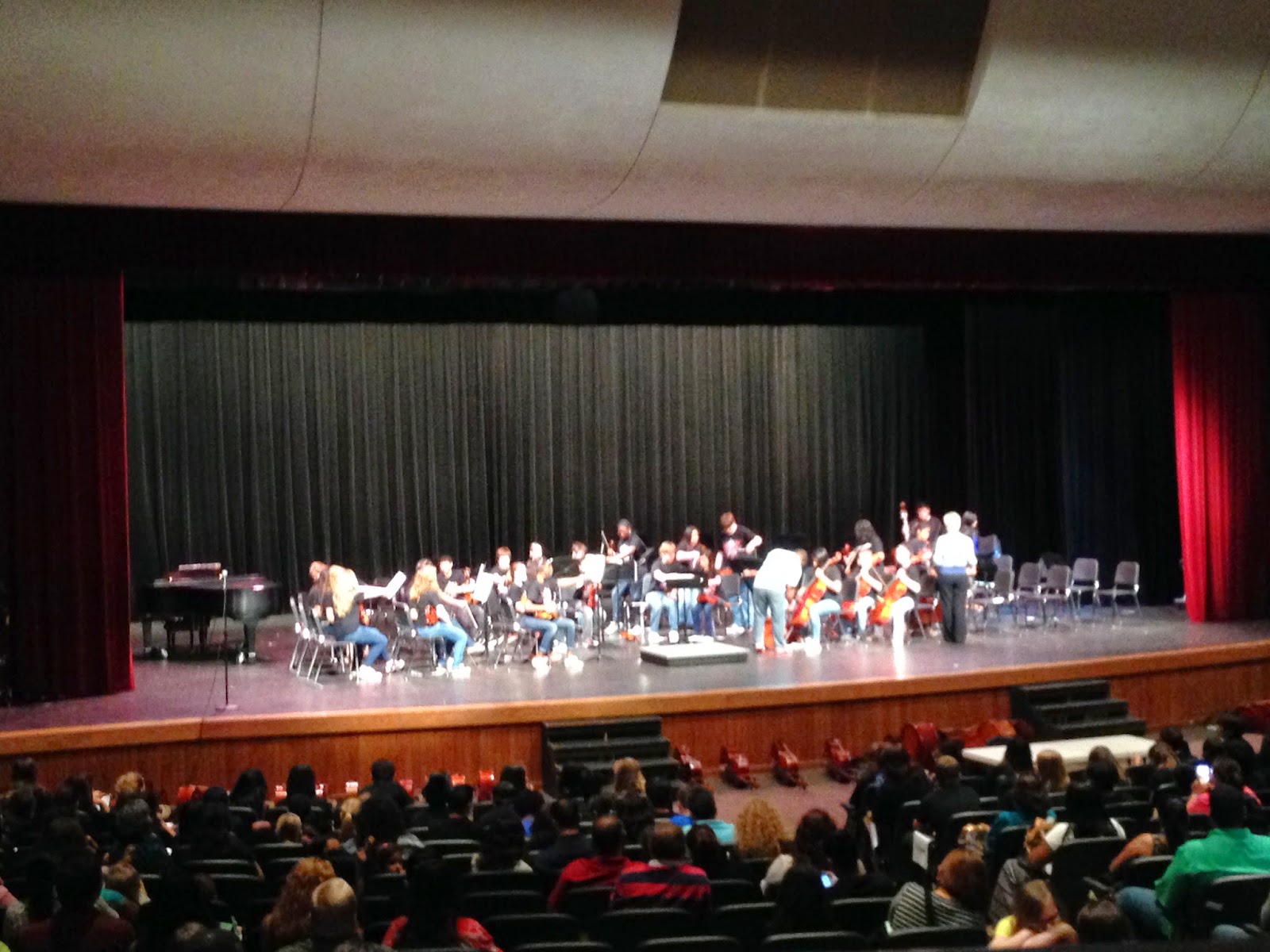 Tuning. They do a stage change between each orchestra group. This is Kyle’s group on stage now – he is in Symphony Orchestra. They are doing one last “fine” tuning before actually doing their performance. This takes a couple of minutes, but it does help. This actually takes less time at the high school level because the high school students have learned how to tune their own instruments mostly by themselves.